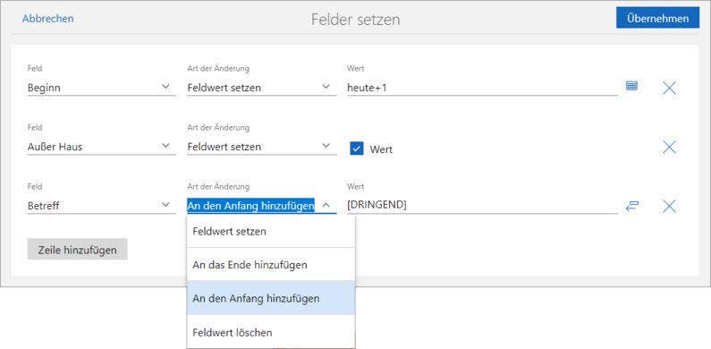 Wert | In der Spalte Wert können Sie einen Wert eingeben oder den Text via Platzhaltern aus einem anderen Datensatz übernehmen. Welche Möglichkeiten zur Verfügung stehen, hängt sowohl vom Feldtyp als auch von der Art der Änderung ab. |