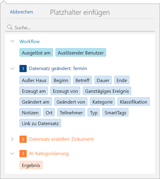 AI-Ergebnis | Wenn Sie mittels AI-Kategorisierung oder AI-Text ein AI-Ergebnis erhalten haben, können Sie dieses Ergebnis als Platzhalter einfügen. |