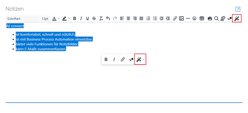 Wenn Sie AI connect einsetzen und die entsprechende AI connect Funktion aktiviert ist, werden für Notizfelder zwei weitere Schaltflächen angezeigt.