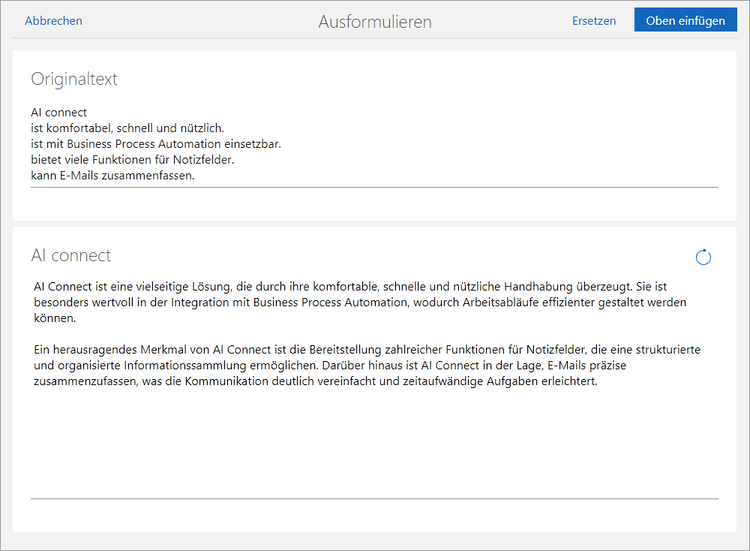 Wenn Sie den AI-Text mit eigenen Anpassungen verwenden möchten, können Sie diese Anpassungen im Feld AI connect schon vor dem Ersetzen oder Einfügen in das Notizfeld vornehmen.