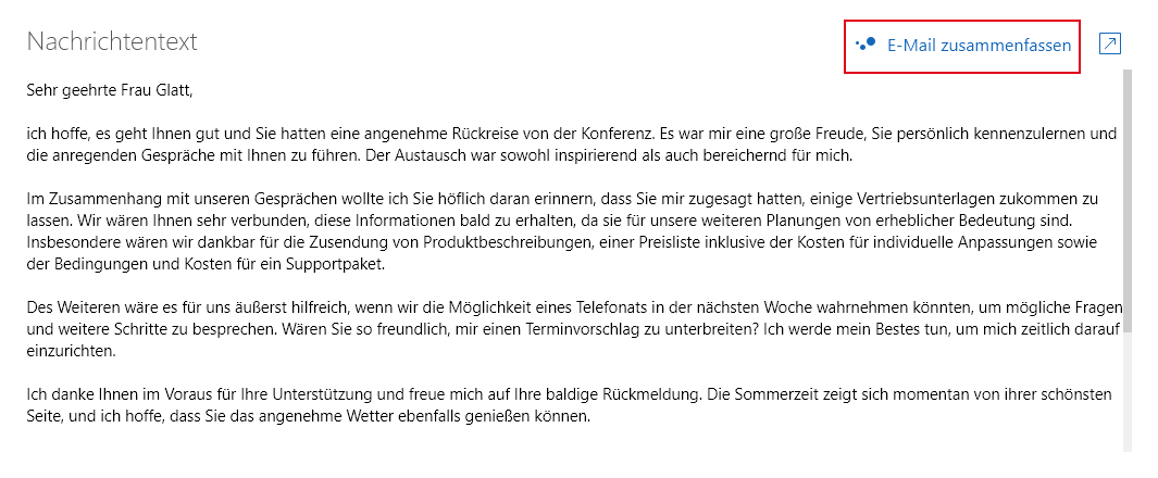 Die Schaltfläche E-Mail zusammenfassen wird oberhalb der Nachricht angezeigt.