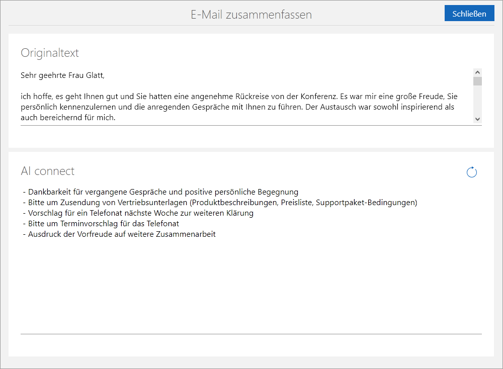 Nach einem Klick auf die Schaltfläche E-Mail zusammenfassen wird das Ergebnisfenster geöffnet. In diesem Fenster können Sie die Zusammenfassung nachlesen.