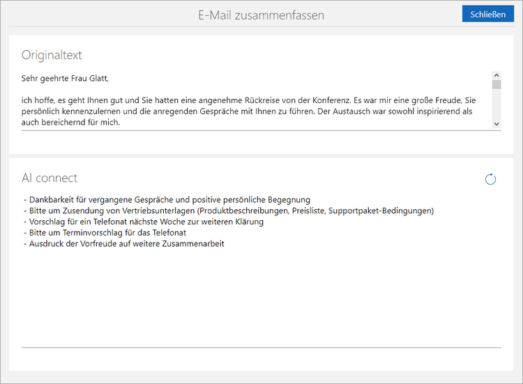 Mithilfe von AI connect können Sie archivierte E-Mails zusammenfassen lassen, sofern die entsprechende Option von einem Administrator aktiviert wurde.