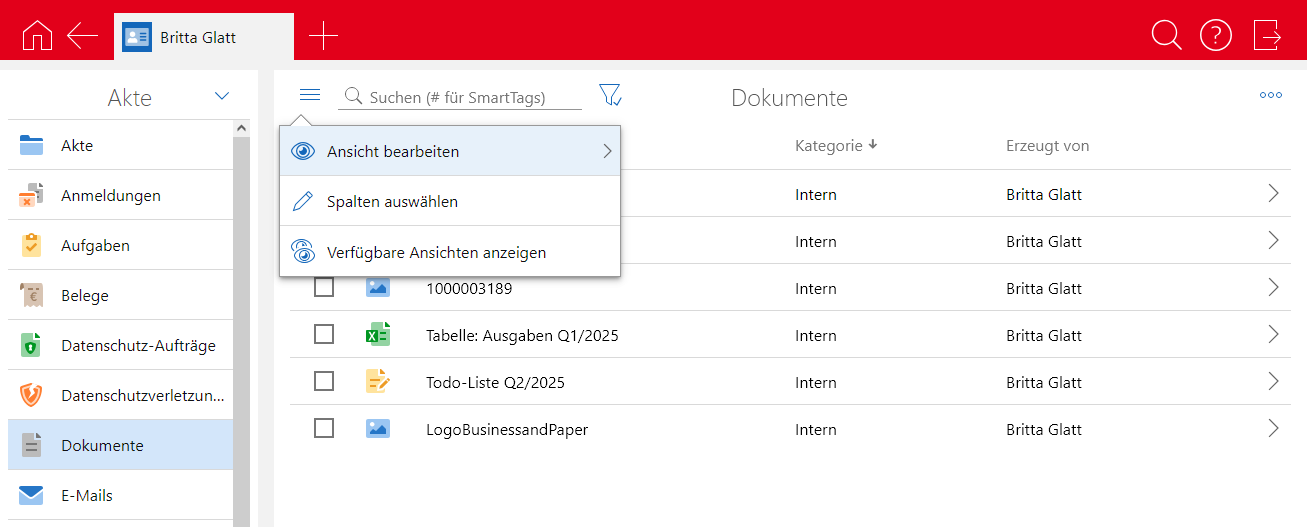 In der erweiterten Liste einer Akte können Sie Aktenansichten konfigurieren, speichern und laden. Die Aktenansichten sind für die Verknüpfungslisten je Datensatz-Typ verfügbar, aber nicht für die gesamte Akte.