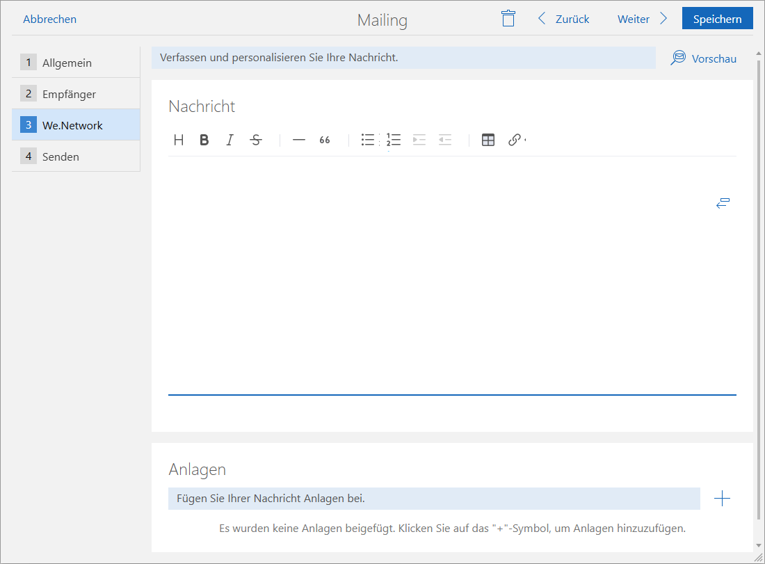 Wenn Sie im vorherigen Schritt den Kommunikationskanal We.Network-Nachricht gewählt haben, können Sie in diesem Schritt Ihre Chat-Nachricht vorbereiten.