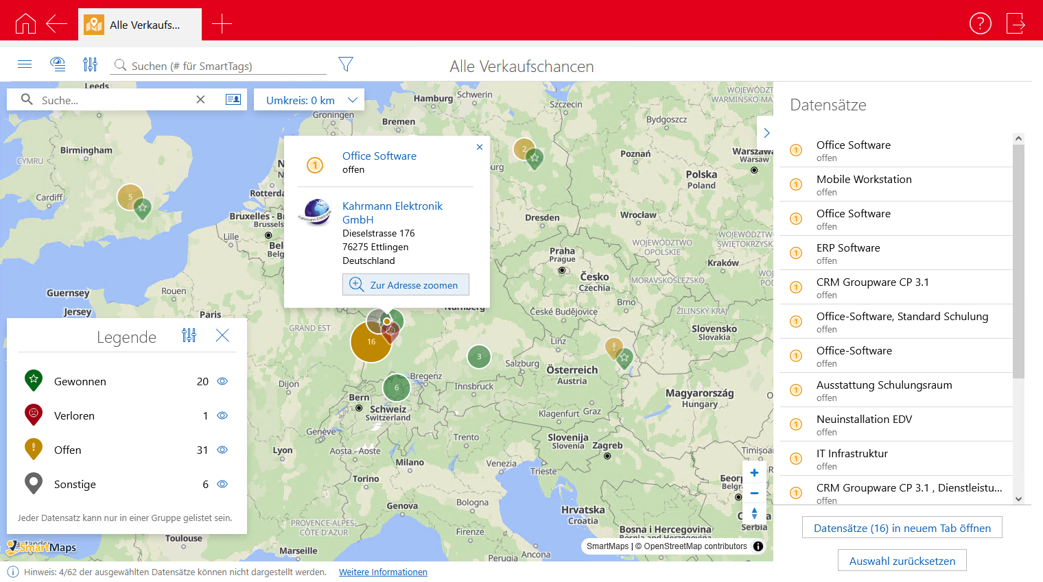 Datensatz in Karte anzeigen | Wenn Sie in der Liste auf einen Datensatz klicken, wird zugehörige Adresse auf der Karte angezeigt. Dabei bleibt der Maßstab der Karte unverändert. Mit der Schaltfläche Zur Adresse zoomen wird der Maßstab der Karte geändert und die jeweilige Adresse wird angezeigt. | ||||