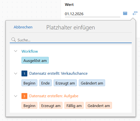Für Platzhalter von Datumsfeldern sind Modifikationen möglich. Beispielsweise können Sie den Platzhalter Ausgelöst am wählen und einen Tag dazuzählen, so dass als Datum ein Tag nach dem Auslösen des Workflows eingetragen wird.