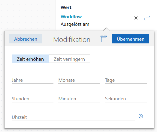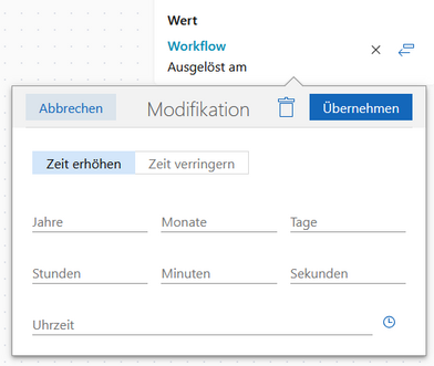 Zeit erhöhen Zeit verringern | Wenn Sie zu dem Wert aus dem Platzhalter weitere Werte addieren möchten, dann wählen Sie Zeit erhöhen. Wenn Sie Werte abziehen möchten, dann wählen Sie Zeit verringern. |