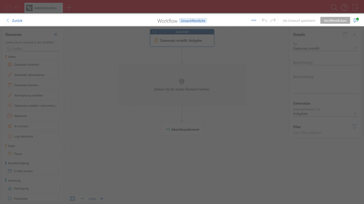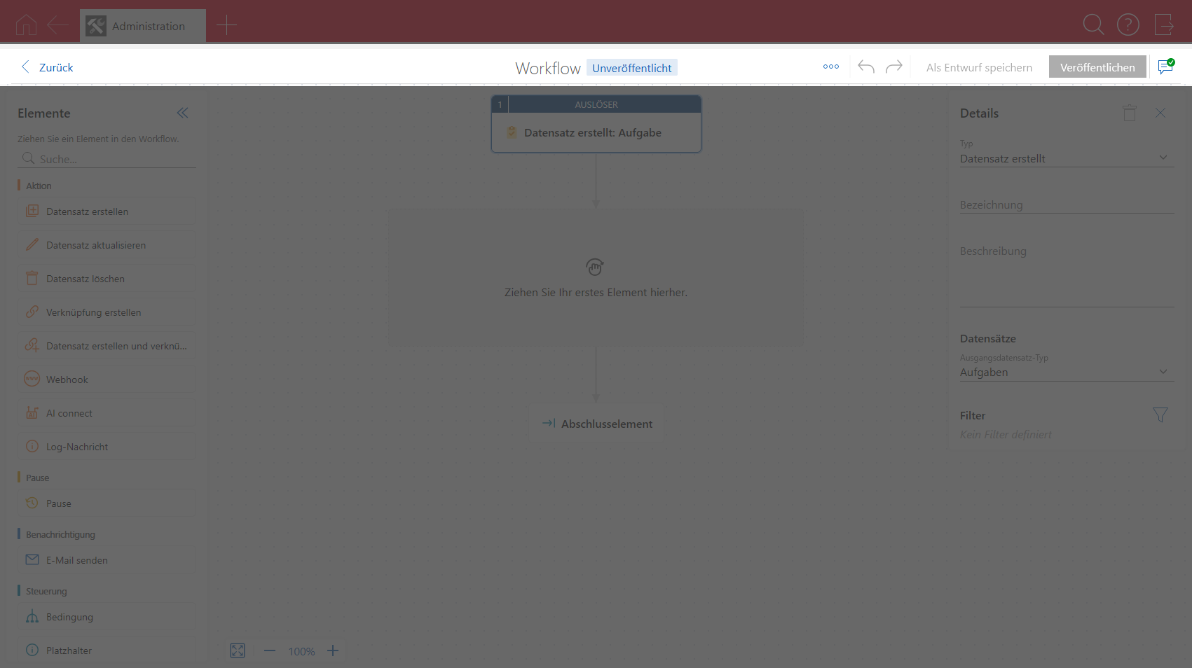 Veröffentlichen | Mit dieser Schaltfläche veröffentlichen Sie den aktuellen Workflow. | |