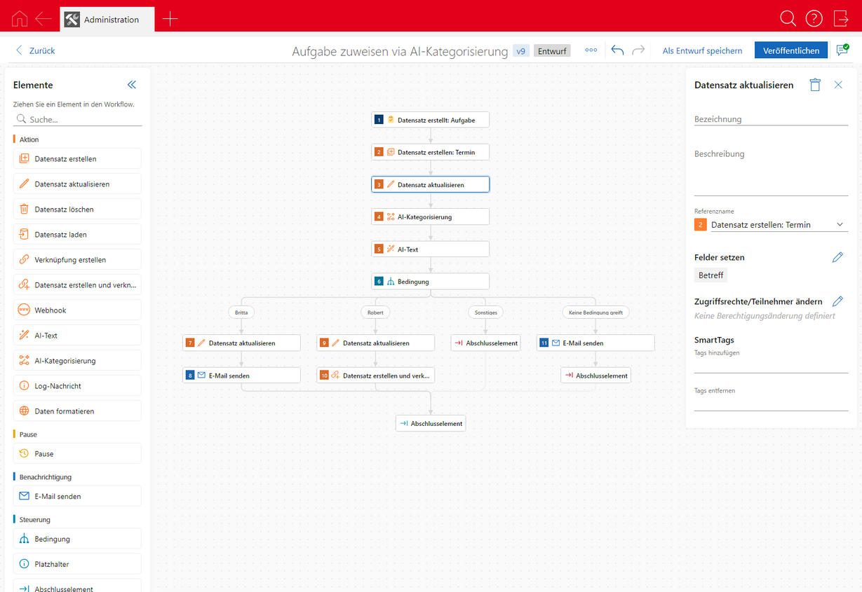 In der Toolbar finden Sie die allgemeinen Funktionen des Workflow-Designers, z. B. Als Entwurf speichern oder das Aktionsmenü.